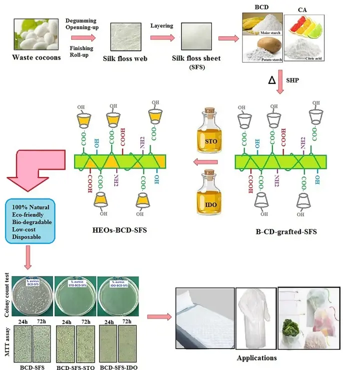 Inclusion Complex, Antioxidant, and Antimicrobial Properties of Silk Floss Sheet Modified with ß-Cyclodextrin and Loaded with Herbal Essential Oils as a Green Tissue